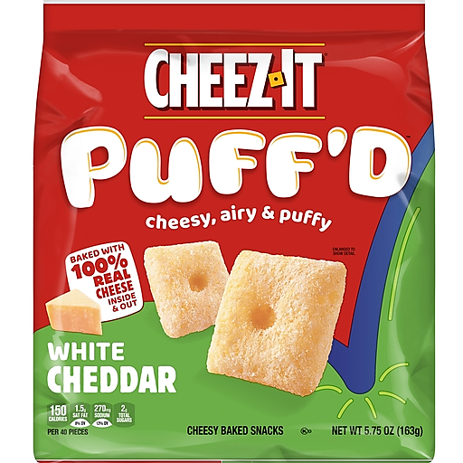 Taste the fun of puffy and airy, bite-sized squares baked with 100% real cheese inside and out. Includes 1, 5.75-ounce bag of Cheez-It Puff’d White Cheddar Cheesy Baked Snacks, bringing you creamy, Cheddar flavor in every bite. This snack experience satisfies your senses with an irresistible crunch followed by melt-in-your-mouth cheesiness that kids and adults crave. Baked with 100% real cheese into every puffy cracker for maximum tastiness; Pack Cheez-It Puff’d in your home pantry for an afternoon pick-me-up or after school snack. Great as a bite when hanging out with friends. Stock up on bags of this family favorite snack food for TV watching, gaming, play time, or anytime. Hungry for a snack that won’t weigh everyone down? Serve up fun with crisp, crunchable, always munchable Cheez-It Puff’d Cheesy Baked Snacks.