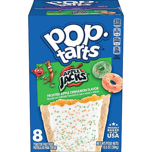 A combination of your favorite Kellogg's breakfast treats, Pop-Tarts Apple Jacks Frosted Apple Cinnamon Flavor Toaster Pastries make a delicious snack to look forward to any time of day. Jump start your day with a sweet and decadent blast of gooey Apple Jacks-inspired apple cinnamon-flavored filling encased in a pastry crust, topped with yummy frosting and crunchy sprinkles. They’re a quick anytime snack for the whole family; Pop-Tarts Toaster Pastries are an ideal companion for lunchboxes, after-school snacks, and busy, on-the-go moments. Not just for mornings, the versatile deliciousness of Pop-Tarts fits into your lifestyle just about anywhere there's time for a snack. Store them in your desk drawer for a pick-me-up at the office, keep them on hand in your pantry, or in the car for a delicious snack on the road. Just pop them in your toaster for a crisp, warm crust, heat them in the microwave, or enjoy them straight out of the foil with a glass of ice-cold milk.